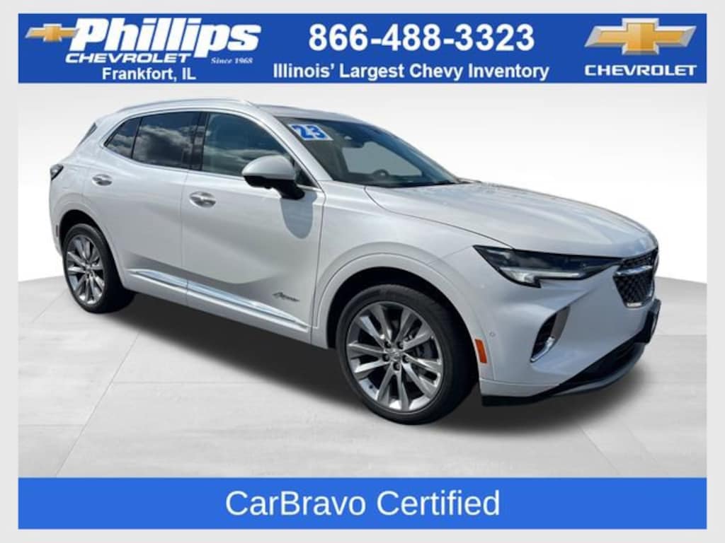 CarBravo Certified, Leather Seats, AWD, Panoramic Roof, Backup Camera, Remote Start, Pwr Dr Seat, Head-Up Display, Navigation, Bose Audio, Side Blind Zone Alert, Heated Seats, Heated Steering Wheel, Ventilated Seats, Memory Seating, Power Liftgate, Apple CarPlay, 20 Wheels, Carfax Buyback Guarantee, Envision Avenir, 4D Sport Utility, 2.0L Turbocharged, 9-Speed Automatic, AWD, White Frost Tricoat, Whisper Beige w/Ebony Accents w/Front Bucket Seats, 4-Wheel Disc Brakes, 8-Way Power Driver Seat Adjuster, ABS brakes, AM/FM radio: SiriusXM, Apple CarPlay/Android Auto, Auto High-beam Headlights, Auto-dimming door mirrors, Auto-dimming Rear-View mirror, Automatic temperature control, Bose Premium 9-Speaker Audio System Feature, Brake assist, Bumpers: body-color, Compass, Driver door bin, Driver vanity mirror, Dual front impact airbags, Dual front side impact airbags, Electronic Stability Control, Emergency communication system: OnStar and Buick connected services capable, Exterior Parking Camera Rear, Following Distance Indicator, Forward Collision Alert, Four wheel independent suspension, Front anti-roll bar, Front Bin Center Console USB Ports, Front Bucket Seats, Front Center Armrest, Front dual zone A/C, Front Passenger 8-Way Power Seat Adjuster, Front Pedestrian Braking, Front reading lights, Fully automatic headlights, Garage door transmitter, HD Radio, Heads-Up Display, Heated door mirrors, Heated Driver & Front Passenger Seats, Heated Rear Outboard Seating Positions, Heated steering wheel, Illuminated entry, IntelliBeam Headlamp Control w/Auto High Beam, Knee airbag, Lane Keep Assist w/Lane Departure Warning, Low tire pressure warning, Memory Card Receptacle Audio System Feature, Memory seat, Navigation System, Occupant sensing airbag, Outside temperature display, Overhead airbag, Overhead console, Passenger door bin, Passenger vanity mirror, Perforated Leather-Appointed Seat Trim, Power door mirrors, Power Liftgate, Power moonroof, Preferred Equipment Group 1SU, Radio data system, Radio: Buick Infotainment System AM/FM w/Nav, Rear anti-roll bar, Rear reading lights, Rear seat center armrest, Rear window defroster, Rear window wiper, Remote keyless entry, Security system, SiriusXM Radio, Speed control, Split folding rear seat, Spoiler, Steering wheel mounted audio controls, Telescoping steering wheel, Tilt steering wheel, Traction control, Trip computer, USB Charging-Only Ports, Variably intermittent wipers, Ventilated Driver & Front Passenger Seats, Wheels: 20 Aluminum w/Avenir Pearl Nickel Finish, Wireless Apple CarPlay/Wireless Android Auto. 2023 Buick Envision White Frost Tricoat Avenir 4D Sport Utility AWD 9-Speed Automatic 22/29 City/Highway MPG 2.0L Turbocharged