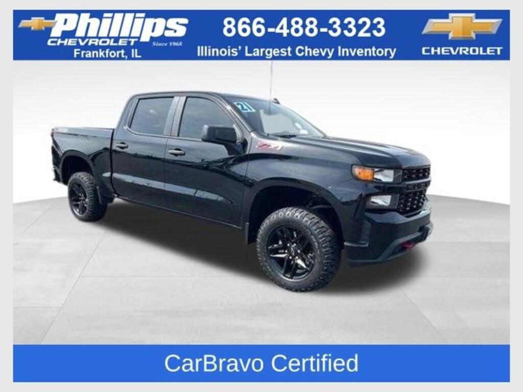 CarBravo Certified, 4WD, Low Miles, Trailering Package, Backup Camera, Remote Start, Apple CarPlay, Aluminum Wheels, Carfax Buyback Guarantee, Silverado 1500 Custom Trail Boss, 4D Crew Cab, EcoTec3 5.3L V8, 6-Speed Automatic Electronic with Overdrive, 4WD, Black, Jet Black w/Cloth Seat Trim, 170 Amp Alternator, 3.42 Rear Axle Ratio, 3.5 Diagonal Monochromatic Display, 4-Wheel Disc Brakes, 40/20/40 Front Split Bench Seat, 4G LTE Wi-Fi Hot Spot Capable, 6 Speakers, ABS brakes, Air Conditioning, AM/FM radio: SiriusXM, Apple CarPlay/Android Auto, Auto-Locking Rear Differential, Auxiliary External Transmission Oil Cooler, Bluetooth® For Phone, Brake assist, Chevrolet Connected Access Capable, Cloth Seat Trim, Color-Keyed Carpeting Floor Covering, Compass, Custom Convenience Package, Deep-Tinted Glass, Delay-off headlights, Driver door bin, Driver vanity mirror, Dual Exhaust w/Polished Outlets, Electric Rear-Window Defogger, Electronic Cruise Control, Electronic Stability Control, EZ Lift Power Lock & Release Tailgate, Front Center Armrest w/Storage, Front License Plate Kit, Front reading lights, Fully automatic headlights, Heated door mirrors, Heavy-Duty Air Filter, High Gloss Black Grille, Hill Descent Control, Hitch Guidance, Illuminated entry, Infotainment Package, Integrated Trailer Brake Controller, LED Cargo Area Lighting, Manual Tilt Wheel Steering Column, Not Equipped w/Active Fuel Management, Off-Road Suspension w/2 Lift, OnStar & Chevrolet Connected Services Capable, Outside temperature display, Overhead console, Passenger door bin, Passenger vanity mirror, Performance Red Recovery Hooks, Polished Exhaust Tip, Power Door Locks, Power door mirrors, Power Front Windows w/Driver Express Up/Down, Power Front Windows w/Passenger Express Down, Power Rear Windows w/Express Down, Preferred Equipment Group 2CX, Premium audio system: Chevrolet Infotainment 3, Radio data system, Radio: Chevrolet Infotainment 3 System, Rear 60/40 Folding Bench Seat (Folds Up), Rear reading lights, Rear step bumper, Remote Keyless Entry, Remote Vehicle Starter System, Security system, SiriusXM Radio, Speed-sensing steering, Standard Tailgate, Suspension Package, Tachometer, Theft Deterrent System (Unauthorized Entry), Tilt steering wheel, Traction control, Trailering Package, Trip computer, Variably intermittent wipers, Voltmeter, Wheels: 18 x 8.5 Black Painted Aluminum. 2021 Chevrolet Silverado 1500 Black Custom Trail Boss 4D Crew Cab 4WD 6-Speed Automatic Electronic with Overdrive 13/18 City/Highway MPG EcoTec3 5.3L V8Recent Arrival!Certification Program Details: Type your description hereWith the internet today, a great value shouldnât be hard to find. Here at Phillips Chevrolet we do the research for you. We monitor the market daily to ensure our customers are getting the best value achievable. We price all of our vehicles to make the buying process as simple and easy as possible. Our internet prices are just one factor that makes us the #1, #2, and out to be the #3 Chevrolet dealerships in Illinois. The #2 Chevy dealership in Illinois is conveniently located just a one block south of 80/94, at 17730 S Torrence Avenue in Lansing, IL 60438.