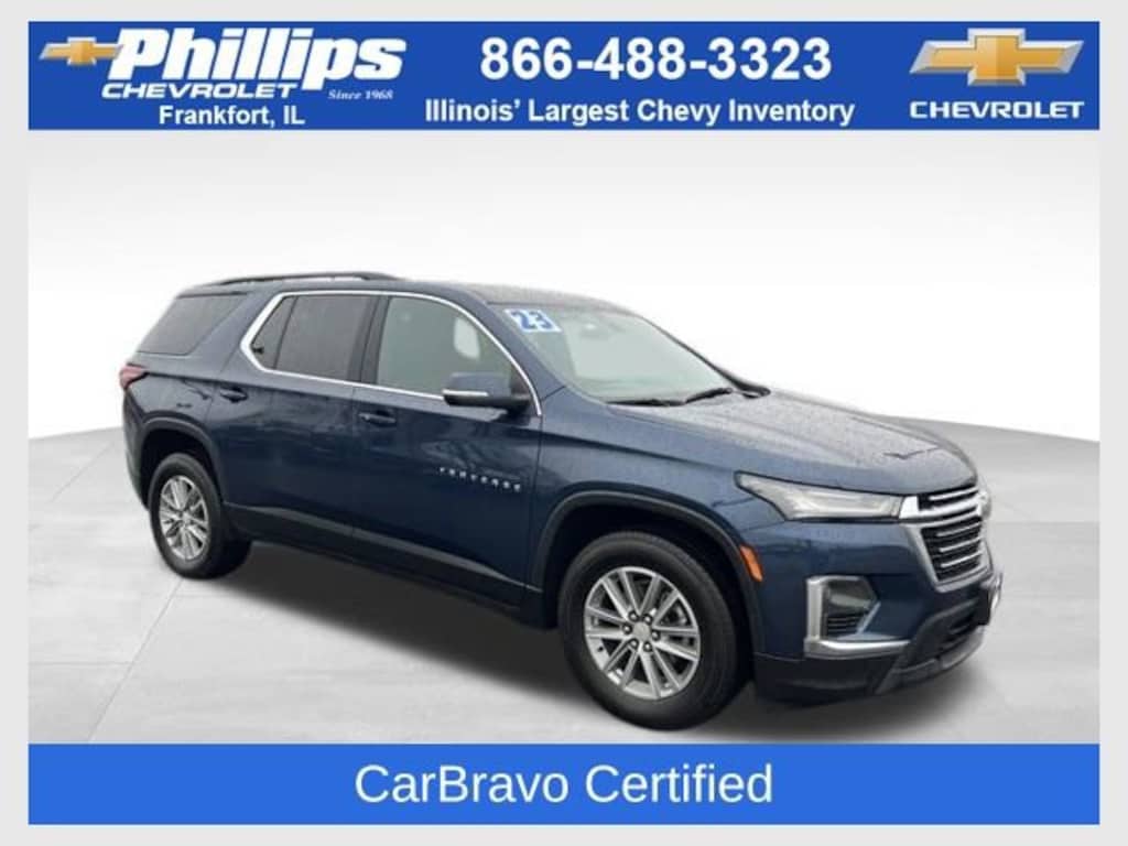 CarBravo Certified, AWD, Backup Camera, Pwr Dr Seat, Forward Collision Alert, Lane Departure Warning, Lane Change Alert, Heated Seats, Power Liftgate, Apple CarPlay, Carfax Buyback Guarantee, Traverse LT 1LT, 4D Sport Utility, 3.6L V6 SIDI VVT, 9-Speed Automatic, AWD, Northsky Blue Metallic, Jet Black Cloth, 2-Way Manual Front Passenger Seat Adjuster, 3.49 Axle Ratio, 3rd row seats: split-bench, 4-Wheel Disc Brakes, 6-Speaker Audio System Feature, 8-Way Power Driver Seat Adjuster, ABS brakes, Air Conditioning, AM/FM radio: SiriusXM, Apple CarPlay/Android Auto, Automatic temperature control, Black Roof Rails, Brake assist, Bumpers: body-color, Compass, Driver door bin, Dual front impact airbags, Dual front side impact airbags, Electronic Stability Control, Emergency communication system, Exterior Parking Camera Rear, Four wheel independent suspension, Front anti-roll bar, Front Bucket Seats, Front Center Armrest, Front dual zone A/C, Front reading lights, Fully automatic headlights, Garage door transmitter, Heated door mirrors, Heated Driver & Front Passenger Seats, Illuminated entry, Leather steering wheel, Low tire pressure warning, Occupant sensing airbag, Outside temperature display, Overhead airbag, Overhead console, Panic alarm, Passenger door bin, Passenger vanity mirror, Power door mirrors, Power Driver Lumbar Control, Power Liftgate, Power steering, Power windows, Preferred Equipment Group 1LT, Premium Cloth Seat Trim, Radio data system, Radio: Chevrolet Infotainment 3 Plus System, Rear air conditioning, Rear anti-roll bar, Rear reading lights, Rear window defroster, Rear window wiper, Remote keyless entry, Security system, SiriusXM w/360L, Speed control, Speed-sensing steering, Spoiler, Steering wheel mounted audio controls, Tachometer, Telescoping steering wheel, Tilt steering wheel, Traction control, Trip computer, Turn signal indicator mirrors, Variably intermittent wipers, Voltmeter, Wheels: 18 Bright Silver-Painted Aluminum. 2023 Chevrolet Traverse Northsky Blue Metallic LT 4D Sport Utility 1LT AWD 9-Speed Automatic 17/25 City/Highway MPG 3.6L V6 SIDI VVT