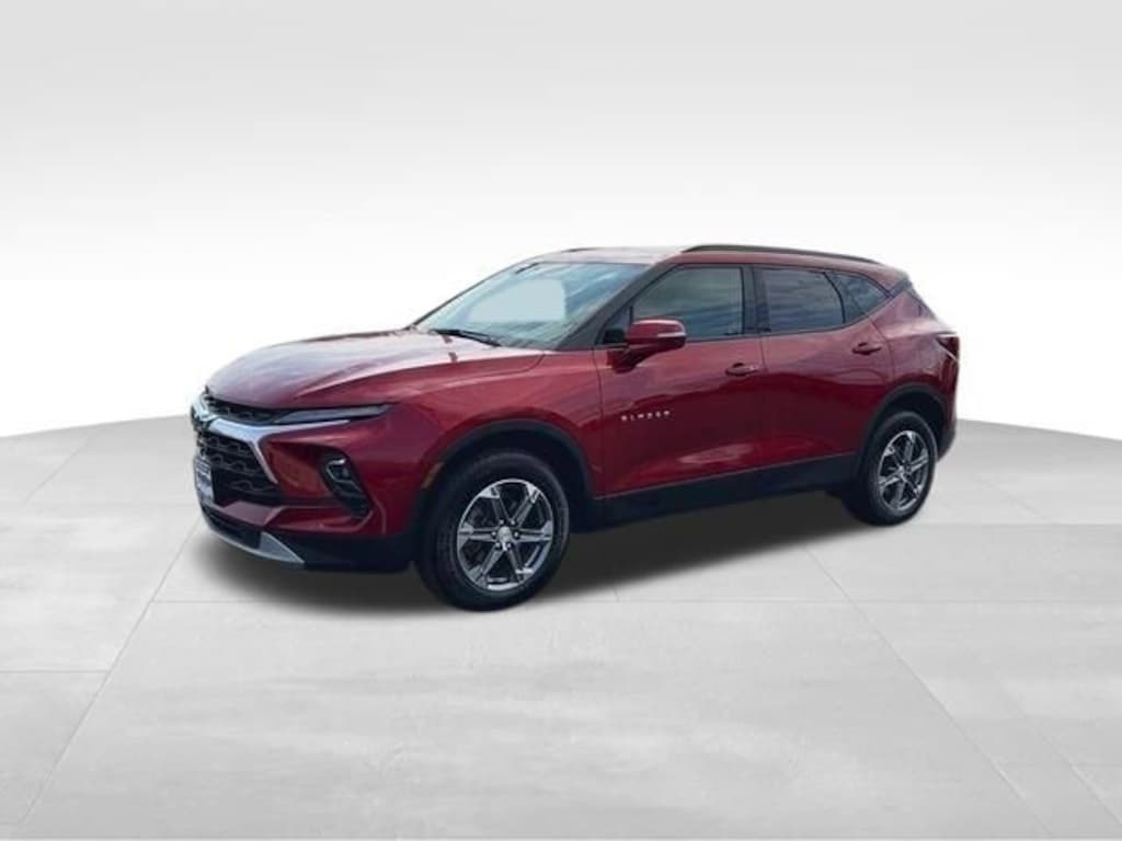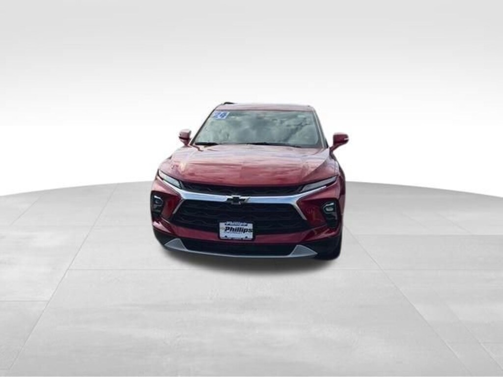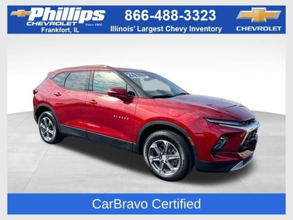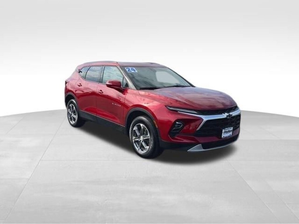 CarBravo Certified, Leather Seats, AWD, Backup Camera, Remote Start, Pwr Dr Seat, Forward Collision Alert, Side Blind Zone Alert, Heated Seats, Power Liftgate, Apple CarPlay, Aluminum Wheels, Carfax Buyback Guarantee, Blazer LT, 4D Sport Utility, 3.6L V6 SIDI, 9-Speed Automatic with Overdrive, AWD, Radiant Red Tintcoat, Jet Black w/Perforated Leather-Appointed Seat Trim, 170 Amp Alternator, 4-Wheel Disc Brakes, 6-Speaker Audio System Feature, 6-Way Power Front Passenger Seat Adjuster, 8-Way Power Driver Seat Adjuster, ABS brakes, AM/FM radio: SiriusXM with 360L, Apple CarPlay/Android Auto, Auto High-beam Headlights, Auto-dimming door mirrors, Auto-dimming Rear-View mirror, Automatic temperature control, Black Roof-Mounted Side Rails, Brake assist, Bumpers: body-color, Child-Seat-Sensing Airbag, Compass, Driver Confidence Package, Driver door bin, Driver vanity mirror, Dual front impact airbags, Dual front side impact airbags, Electronic Stability Control, Emergency communication system: OnStar and Chevrolet connected services capable, Four wheel independent suspension, Front & Rear Black Bowties, Front anti-roll bar, Front Bucket Seats, Front Center Armrest, Front dual zone A/C, Front reading lights, Fully automatic headlights, Garage door transmitter, Heated door mirrors, Heated Driver & Front Passenger Seats, Illuminated entry, Inside Rear-View Auto-Dimming Mirror, Knee airbag, Lane Change Alert w/Side Blind Zone Alert, Leather Shift Knob, Leather steering wheel, Low tire pressure warning, Not Equipped w/Rear Park Assist, Occupant sensing airbag, Outside Heated Power-Adjustable Body-Color Mirrors, Outside temperature display, Overhead airbag, Overhead console, Passenger door bin, Passenger vanity mirror, Perforated Leather-Appointed Seat Trim, Power Driver Lumbar Control, Power Liftgate, Power passenger seat, Preferred Equipment Group 3LT, Premium audio system: Chevrolet Infotainment 3 Plus, Radio data system, Radio: Chevrolet Infotainment 3 Plus System, Rear anti-roll bar, Rear Cross Traffic Alert, Rear Park Assist w/Audible Warning, Rear Power Programmable Liftgate, Rear reading lights, Rear seat center armrest, Rear window defroster, Rear window wiper, Remote keyless entry, Ride & Handling Suspension, Security system, SiriusXM w/360L, Speed control, Speed-sensing steering, Split folding rear seat, Spoiler, Steering wheel mounted audio controls, Tachometer, Telescoping steering wheel, Tilt steering wheel, Traction control, Trip computer, Turn signal indicator mirrors, Universal Home Remote, Variably intermittent wipers, Voltmeter, Wheels: 18 Grazen Metallic Aluminum. 2024 Chevrolet Blazer Radiant Red Tintcoat LT 4D Sport Utility AWD 9-Speed Automatic with Overdrive 18/26 City/Highway MPG 3.6L V6 SIDI