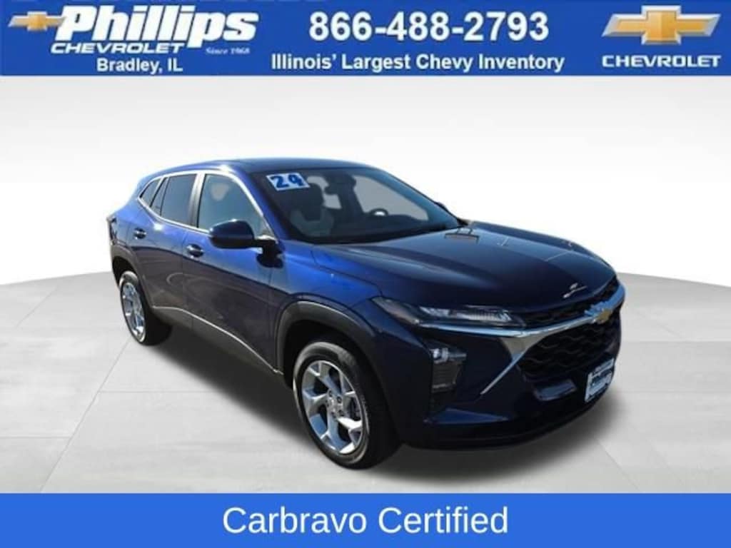 Carbravo Certified, One Owner, Apple CarPlay, Android Auto, Keyless Entry, Back Up Camera, Bluetooth, Cruise Control, Forward Collision Alert, Lane Assist, Pedestrian Monitoring, Power Locks, Power Windows, Push Button Start, Remaining factory warranty, Chevy Safety Assist Package, Lane Change Alert, Carfax Buyback Guarantee, Trax LS, 4D Sport Utility, 1.2L Ecotec Turbo DOHC DI w/VVT, 6-Speed Automatic, FWD, Blue Glow Metallic, Jet Black/Gray With Blue Accents Cloth, 3.50 Final Drive Axle Ratio, 4-Speaker Audio System Feature, 4-Wheel Disc Brakes, 6-Way Manual Driver Seat Adjuster, ABS brakes, Auto High-beam Headlights, Body-Color Painted Mirror Caps, Brake assist, Bumpers: body-color, Carpeted Rear Floor Mats, Compass, Delay-off headlights, Driver door bin, Driver vanity mirror, Dual front impact airbags, Dual front side impact airbags, Electronic Stability Control, Emergency communication system: OnStar and Chevrolet connected services capable, Exterior Parking Camera Rear, Front & Rear All-Weather Floor Mats, Front anti-roll bar, Front Bucket Seats, Front Center Armrest, Front reading lights, Front wheel independent suspension, Fully automatic headlights, Heated Driver & Front Passenger Seats, Heated Power-Adjustable Outside Mirrors, Illuminated entry, Low tire pressure warning, LS Convenience Package, Occupant sensing airbag, Outside temperature display, Overhead airbag, Overhead console, Panic alarm, Passenger door bin, Passenger vanity mirror, Power door mirrors, Preferred Equipment Group 1LS, Premium audio system: Chevrolet Infotainment 3, Rear window defroster, Rear window wiper, Remote keyless entry, Remote Start, Security system, Speed control, Split folding rear seat, Spoiler, Steering wheel mounted audio controls, Tachometer, Telescoping steering wheel, Tilt steering wheel, Traction control, Trip computer, Variably intermittent wipers, Wheels: 17 Silver Painted Aluminum. CARFAX One-Owner. Clean CARFAX. Certified. Blue Glow Metallic 2024 Chevrolet Trax LS FWD 6-Speed Automatic 1.2L Ecotec Turbo DOHC DI w/VVTOdometer is 2085 miles below market average! 28/32 City/Highway MPGCertification Program Details: Type your description here Awards:* Car and Driver 10 BestCar and Driver, January 2017.With the internet today, a great value shouldn't be hard to find. Here at Phillips Chevrolet we do the research for you. We monitor the market daily to ensure our customers are getting the best value achievable. We price all of our vehicles to make the buying process as simple and easy as possible. Our internet prices are just one factor that makes us the #1, #2, and out to be the #3 Chevrolet dealerships in Illinois. The future #3 Chevy dealership in Illinois is conveniently located at 1400 Locke Drive, the corner of I-57 & IL 50, in Bradley/Bourbonnais, IL 60914.