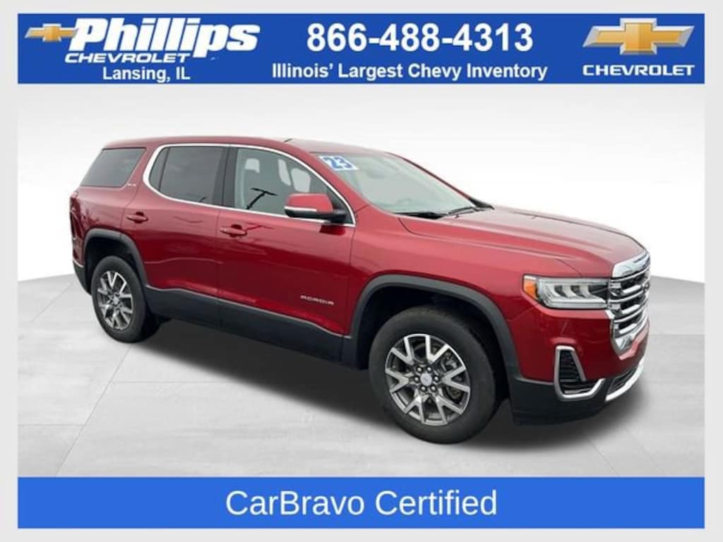 CarBravo Certified, ONE Owner!, Accident FREE, No Added Cert. Fees, Certified Multi-Point Inspection, Fully Serviced, Apple CarPlay, Keyless Entry, Forward Collision Alert, Side Blind Zone Alert, Rear Cross Traffic Alert, Backup Camera, BLUETOOTH, Power Windows/Locks, Power Seating, PUSH BUTTON START!, INTELLIBEAM, 18 WHEELS!, Cruise Control, Carfax Buyback Guarantee, Acadia SLE, 4D Sport Utility, 2.0L Turbocharged, 9-Speed Automatic, FWD, Volcanic Red Tintcoat, Jet Black Cloth, 3.47 Final Drive Axle Ratio, 3rd row seats: split-bench, 4-Way Manual Driver Seat Adjuster, 4-Way Manual Passenger Seat Adjuster, 4-Wheel Disc Brakes, 6-Passenger (2-2-2 Seating Configuration), 6-Speaker Audio System Feature, ABS brakes, AM/FM radio: SiriusXM, Apple CarPlay/Android Auto, Brake assist, Bumpers: body-color, Compass, Driver door bin, Driver vanity mirror, Dual front impact airbags, Dual front side impact airbags, Electronic Stability Control, Emergency communication system: OnStar and GMC connected services capable, Four wheel independent suspension, Front anti-roll bar, Front Bucket Seats, Front Center Armrest, Front dual zone A/C, Front reading lights, Fully automatic headlights, Heated door mirrors, Illuminated entry, Knee airbag, Low tire pressure warning, Occupant sensing airbag, Outside temperature display, Overhead airbag, Overhead console, Panic alarm, Passenger door bin, Passenger vanity mirror, Power door mirrors, Power steering, Power windows, Preferred Equipment Group 3SA, Premium Cloth Seat Trim, Radio data system, Radio: AM/FM w/8 Diagonal Multi-Touch Display, Rear air conditioning, Rear anti-roll bar, Rear reading lights, Rear window defroster, Rear window wiper, Remote keyless entry, Security system, SiriusXM Radio, Speed control, Speed-sensing steering, Spoiler, Steering wheel mounted audio controls, Tachometer, Telescoping steering wheel, Tilt steering wheel, Traction control, Trip computer, Turn signal indicator mirrors, Variably intermittent wipers, Voltmeter, Wheels: 18 Machined Aluminum w/Dark Accents, Wireless Apple CarPlay/Wireless Android Auto. 2023 GMC Acadia Volcanic Red Tintcoat SLE 4D Sport Utility FWD 9-Speed Automatic 22/29 City/Highway MPG 2.0L Turbocharged22/29 City/Highway MPG Recent Arrival!Certification Program Details: Type your description hereWith the internet today, a great value shouldnât be hard to find. Here at Phillips Chevrolet we do the research for you. We monitor the market daily to ensure our customers are getting the best value achievable. We price all of our vehicles to make the buying process as simple and easy as possible. Our internet prices are just one factor that makes us the #1, #2, and out to be the #3 Chevrolet dealerships in Illinois. The #2 Chevy dealership in Illinois is conveniently located just a one block south of 80/94, at 17730 S Torrence Avenue in Lansing, IL 60438.