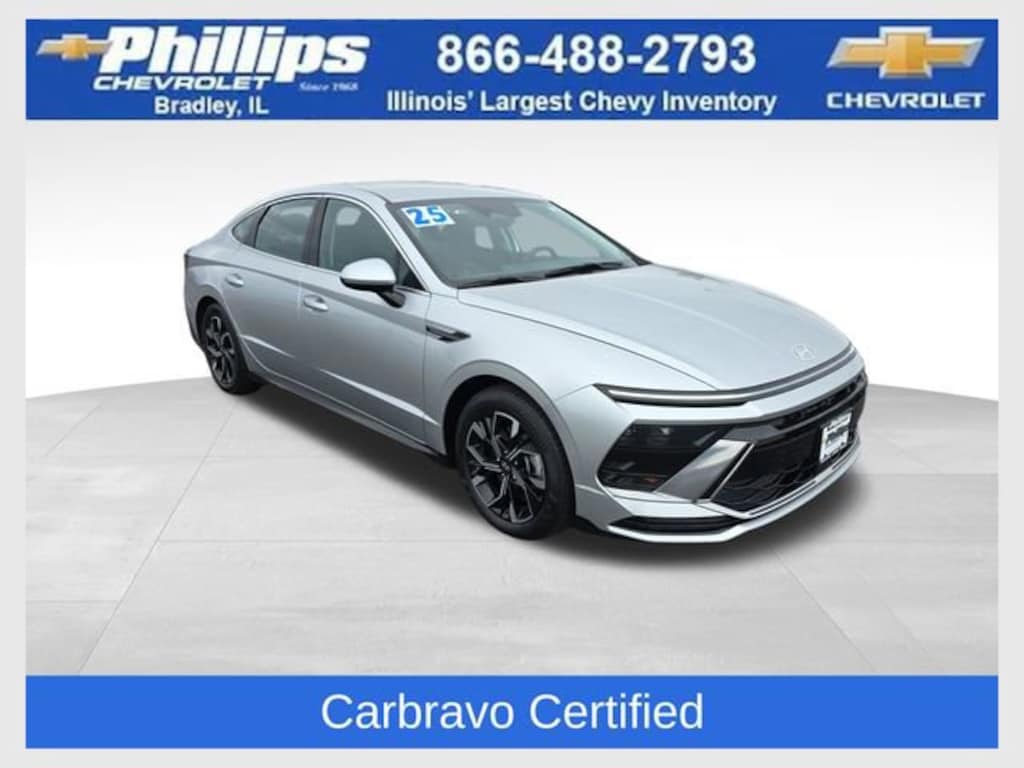 Carbravo Certified, One Owner, Apple CarPlay, Android Auto, Keyless Entry, Back Up Camera, Blind Spot Monitoring, Bluetooth, Cruise Control, Heated seats, Forward Collision Alert, Lane Assist, Power Locks, Power Seating, Power Windows, Remote start, Lane Change Alert, Carfax Buyback Guarantee, Sonata SEL, 4D Sedan, I4, 8-Speed Automatic, FWD, Aero Silver, Black w/Cloth Seating Surfaces, 17 x 7.0J Aluminum Alloy Wheels, 4-Wheel Disc Brakes, 6 Speakers, ABS brakes, Air Conditioning, Apple CarPlay & Android Auto, Auto High-beam Headlights, Automatic temperature control, Brake assist, Bumpers: body-color, Cloth Seating Surfaces, Driver door bin, Driver vanity mirror, Electronic Stability Control, Exterior Parking Camera Rear, Four wheel independent suspension, Front Bucket Seats, Front Center Armrest, Front dual zone A/C, Front reading lights, Fully automatic headlights, Heated door mirrors, Heated Front Bucket Seats, Illuminated entry, Option Group 01, Outside temperature display, Overhead console, Panic alarm, Passenger door bin, Passenger vanity mirror, Power door mirrors, Power driver seat, Radio data system, Radio: AM/FM/HD/SiriusXM, Rear seat center armrest, Rear window defroster, Remote keyless entry, Security system, Speed control, Speed-sensing steering, Speed-Sensitive Wipers, Split folding rear seat, Steering wheel mounted audio controls, Tachometer, Telescoping steering wheel, Tilt steering wheel, Traction control, Trip computer, Variably intermittent wipers. CARFAX One-Owner. Clean CARFAX. Certified. Aero Silver 2025 Hyundai Sonata SEL FWD 8-Speed Automatic I4