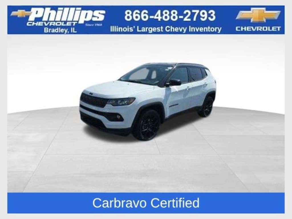 Carbravo Certified, Certifed Multi Point Inspection, One Owner, Carfax- Accident Free, Apple CarPlay, Keyless Entry, 4WD, Back Up Camera, Blind Spot Monitoring, Bluetooth, Cruise Control, GAS SAVER, Heated seats, Heated steering wheel, Power lift gate, Power Locks, Power Seating, Power Windows, Push Button Start, Remote start, 17 Wheels, Carfax Buyback Guarantee, Compass Altitude, 4D Sport Utility, 2.4L I4, 9-Speed 948TE Automatic, 4WD, Bright White Clearcoat, Black Cloth, 115V Auxiliary Power Outlet, 17 x 7 Painted Aluminum Wheels, 2nd Row USB Type A/C Charge Only, 3.73 Axle Ratio, 4-Wheel Disc Brakes, 6 Speakers, ABS brakes, Air Conditioning ATC w/Dual Zone Control, All-Season Floor Mats, Altitude Special Edition, AM/FM radio: SiriusXM, Anti-whiplash front head restraints, Auto-Dimming Rear-View Mirror, Black Day Light Opening Moldings, Black Headliner, Black Roof, Brake assist, Bright Exhaust Tip, Bumpers: body-color, Compass, Convenience Group, Driver door bin, Driver vanity mirror, Dual front impact airbags, Dual front side impact airbags, Electronic Stability Control, Emergency communication system: SiriusXM Guardian, Foot Activated Open 'N Go Liftgate, Four wheel independent suspension, Front anti-roll bar, Front Bucket Seats, Front Center Armrest w/Storage, Front reading lights, Fully automatic headlights, Gloss Black Badges, Gloss Black Grille & Crosshairs, Gloss Black Lower Rear Fascia Valance, Heated door mirrors, Heated Front Seats, Heated Steering Wheel, Humidity Sensor, Illuminated entry, Knee airbag, Leather Shift Knob, Leather Wrapped Steering Wheel, Light Tungsten Interior Accent Stitching, Low tire pressure warning, Occupant sensing airbag, Outside temperature display, Overhead airbag, Overhead console, Panic alarm, ParkView Rear Back-Up Camera, Passenger door bin, Passenger vanity mirror, Piano Black Interior Accents, Power Adjust 8-Way Driver Seat, Power Liftgate, Power steering, Power windows, Premium Cloth/Vinyl Bucket Seats, Quick Order Package 2GB Altitude, Radio: Uconnect 5 w/10.1 Display, Rear anti-roll bar, Rear seat center armrest, Rear window wiper, Remote keyless entry, Remote Start System, Reversible Carpet/Vinyl Cargo Mat, Security Alarm, Speed control, Split folding rear seat, Tachometer, Telescoping steering wheel, Tilt steering wheel, Traction control, Trip computer, Universal Garage Door Opener, Variably intermittent wipers, Vehicle Information Center, Wheels: 18 x 7 Gloss Black Painted Aluminum, Windshield Wiper De-Icer. CARFAX One-Owner. Clean CARFAX. Certified. Bright White Clearcoat 2022 Jeep Compass Altitude 4WD 9-Speed 948TE Automatic 2.4L I4Odometer is 4565 miles below market average! 22/30 City/Highway MPGCertification Program Details: Type your description hereWith the internet today, a great value shouldn't be hard to find. Here at Phillips Chevrolet we do the research for you. We monitor the market daily to ensure our customers are getting the best value achievable. We price all of our vehicles to make the buying process as simple and easy as possible. Our internet prices are just one factor that makes us the #1, #2, and out to be the #3 Chevrolet dealerships in Illinois. The future #3 Chevy dealership in Illinois is conveniently located at 1400 Locke Drive, the corner of I-57 & IL 50, in Bradley/Bourbonnais, IL 60914.
