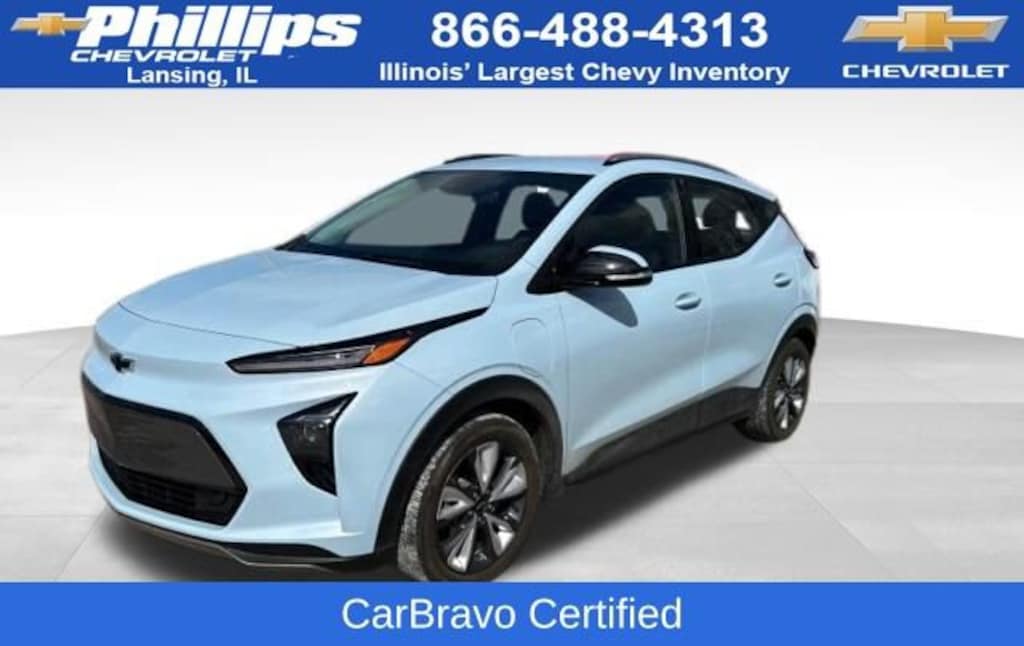 CarBravo Certified, ONE Owner!, Accident FREE, No Added Cert. Fees, Certified Multi-Point Inspection, Heated Seats, Heated Steering Wheel, Apple CarPlay, Keyless Entry, Ventilated Seats, Forward Collision Alert, Side Blind Zone Alert, Rear Cross Traffic Alert, Backup Camera, BLUETOOTH, Power Windows/Locks, Power Seating, PUSH BUTTON START!, GAS SAVER!, INTELLIBEAM, Remote Start, 17 WHEELS!, Lane Departure Warning, Lane Keep Assist, Carfax Buyback Guarantee, COMFORT PACKAGE, DRIVER CONFIDENCE PACKAGE, CONVENIENCE PACKAGE, ICE BLUE METALLIC, Bolt EUV LT, 4D Sport Utility, Electric Motor, 1-Speed Automatic, FWD, Tide Metallic (Ice Blue), Jet Black/Nightshift Blue Leather, 2-Way Power Driver Lumbar Seat Adjuster, 4-Wheel Disc Brakes, 6-Speaker Audio System, 6-Way Manual Passenger Seat Adjuster, 7.05 Final Drive Axle Ratio, 8-Way Power Driver Seat Adjuster, ABS brakes, Air Conditioning, AM/FM radio: SiriusXM with 360L, Apple CarPlay/Android Auto, Auto-Dimming Inside Rear-View Mirror, Automatic temperature control, Brake assist, Bumpers: body-color, Cloth Seat Trim, Comfort Package, Compass, Convenience Package, Driver Confidence Package, Driver door bin, Driver vanity mirror, Dual front impact airbags, Dual front side impact airbags, Electronic Stability Control, Emergency communication system: OnStar and Chevrolet connected services capable, Flat-Bottom Leather-Wrapped Steering Wheel, Front anti-roll bar, Front Bucket Seats, Front Center Armrest, Front Passenger Seatback Map Pocket, Front reading lights, Front wheel independent suspension, Fully automatic headlights, Heated door mirrors, Heated Driver & Front Passenger Seats, Heated Steering Wheel, Illuminated entry, Knee airbag, Lane Change Alert w/Side Blind Zone Alert, Low tire pressure warning, Occupant sensing airbag, Outside temperature display, Overhead airbag, Overhead console, Panic alarm, Passenger door bin, Passenger vanity mirror, Perforated Leather-Appointed Seat Trim, Performance Ride & Handling Suspension, Power door mirrors, Power steering, Power windows, Preferred Equipment Group 2LT, Premium audio system: Chevrolet Infotainment 3 Plus, Radio: Chevrolet Infotainment 3 Plus System, Rear Center Armrest, Rear Cross-Traffic Alert, Rear Park Assist, Rear reading lights, Rear side impact airbag, Rear window defroster, Rear window wiper, Remote keyless entry, Roof rack: rails only, SD Card Receptacle, Security system, SiriusXM Radio w/360L, Speed control, Split folding rear seat, Steering wheel mounted audio controls, Telescoping steering wheel, Tilt steering wheel, Traction control, Trip computer, Turn signal indicator mirrors, Variably intermittent wipers, Ventilated Driver Seat, Ventilated Front Passenger Seat, Wheels: 17 Dark Android Painted Aluminum. 2023 Chevrolet Bolt EUV Tide Metallic (Ice Blue) LT 4D Sport Utility FWD 1-Speed Automatic 125/104 City/Highway MPG Electric Motor