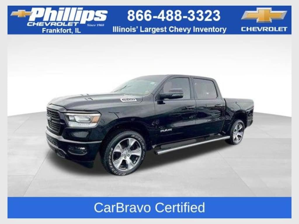 CarBravo Certified, Leather Seats, Bucket Seats w/ Center Console, 4WD, Sport Appearance Package, Trailering Package, Backup Camera, Remote Start, Pwr Dr Seat, Forward Collision Alert, Navigation, Side Blind Zone Alert, Rear Cross Traffic Alert, Rear Park Assist, Harman Kardon Audio, Heated Seats, Heated Steering Wheel, Apple CarPlay, 20 Wheels, Carfax Buyback Guarantee, 1500 Laramie, 4D Crew Cab, HEMI 5.7L V8 Multi Displacement VVT eTorque, 8-Speed Automatic, 4WD, Diamond Black Crystal Pearlcoat, Black w/Premium Leather Trimmed Bucket Seats, #1 Seat Foam Cushion, 12 Touchscreen Display, 2nd Row In Floor Storage Bins, 3 Rear Seat Head Restraints, 3.92 Rear Axle Ratio, 4 Way Front Headrests, 4-Wheel Disc Brakes, 48V Belt Starter Generator, 4G LTE Wi-Fi Hot Spot, ABS brakes, AM/FM radio: SiriusXM with 360L, Anti-Spin Differential Rear Axle, Apple CarPlay, Auto High Beam Headlamp Control, Auto-dimming Rear-View mirror, Automatic temperature control, Black Interior Accents, Blind Spot & Cross Path Detection, Body Color Exterior Mirrors, Body Color Front Bumper, Body Color Premium Power Mirrors, Body Color Rear Bumper w/Step Pads, Brake assist, Bucket Seats, Center Console Parts Module, Class IV Receiver Hitch, Compass, Connected Travel & Traffic Services, Connectivity - US/Canada, Disassociated Touchscreen Display, Driver door bin, Driver Seat Memory, Driver vanity mirror, Dual front impact airbags, Dual front side impact airbags, Electric Shift-On-Demand Transfer Case, Electronic Stability Control, Exterior Mirrors Courtesy Lamps, Exterior Mirrors w/Heating Element, Exterior Mirrors w/Memory, Exterior Mirrors w/Supplemental Signals, Foam Bottle Insert (Door Trim Panel), For Details, Visit DriveUconnect.com, For More Info, Call 800-643-2112, Front anti-roll bar, Front Center Armrest w/Storage, Front Door Accent Lighting, Front dual zone A/C, Front fog lights, Front LED Fog Lamps, Front reading lights, Front Seat Back Map Pockets, Front wheel independent suspension, Full Length Upgraded Floor Console, Fully automatic headlights, Garage door transmitter, Global Telematics Box Module (TBM), Google Android Auto, GPS Antenna Input, GPS Navigation, Grille Surround 3 Body Color Tex 2 Black, harman/kardon 19 Speaker Premium Sound, HD Radio, Heated door mirrors, Heated Front Seats, Heated Steering Wheel, Illuminated entry, Integrated Center Stack Radio, Integrated Voice Command w/Bluetooth, Laramie Level B Equipment Group, Leather steering wheel, Leather Trimmed Bucket Seats, LED Reflector Headlamps, Low tire pressure warning, Memory seat, Occupant sensing airbag, Outside temperature display, Overhead airbag, Overhead console, Panic alarm, ParkSense Front/Rear Park Assist w/Stop, ParkView Rear Back-Up Camera, Passenger door bin, Passenger vanity mirror, Pedal memory, Power 2-Way Driver Lumbar Adjust, Power 2-Way Passenger Lumbar Adjust, Power 8-Way Driver & Passenger Seats, Power door mirrors, Power driver seat, Power-Folding Mirrors, Quick Order Package 27H Laramie, Radio: Uconnect 5 Nav w/12.0 Display, Rain Sensitive Windshield Wipers, RAM Grille Badge - Chrome, Rear 60/40 Folding Seat, Rear anti-roll bar, Rear Door Accent Lighting, Rear Power Sliding Window, Rear seat center armrest, Rear step bumper, Rear Underseat Compartment Storage, Rear Wheelhouse Liners, Rear Window Defroster, Remote keyless entry, Remote Tailgate Release, Security system, SiriusXM Radio Service, SiriusXM w/360L, Speed control, Sport Appearance Package, Sport Decal, Sport Performance Hood, Steering wheel mounted audio controls, Tachometer, Telescoping steering wheel, Tilt steering wheel, Traction control, Trailer Brake Control, Trip computer, Turn signal indicator mirrors, USB Host Flip, Ventilated Front Seats, Voltmeter, Wheels: 20 x 9 Premium Painted w/Inserts. 2023 Ram 1500 Diamond Black Crystal Pearlcoat Laramie 4D Crew Cab 4WD 8-Speed Automatic 17/22 City/Highway MPG HEMI 5.7L V8 Multi Displacement VVT eTorque